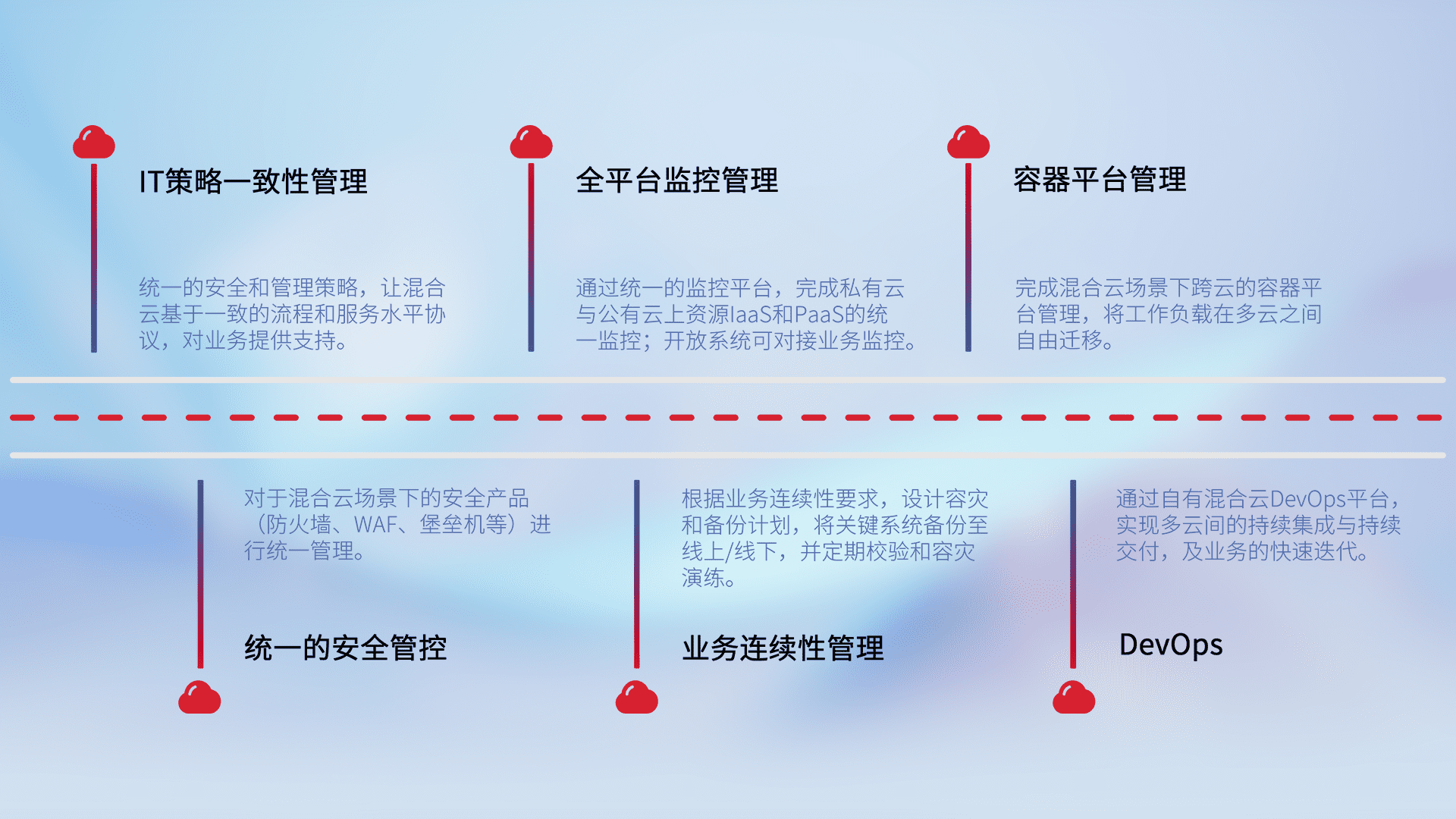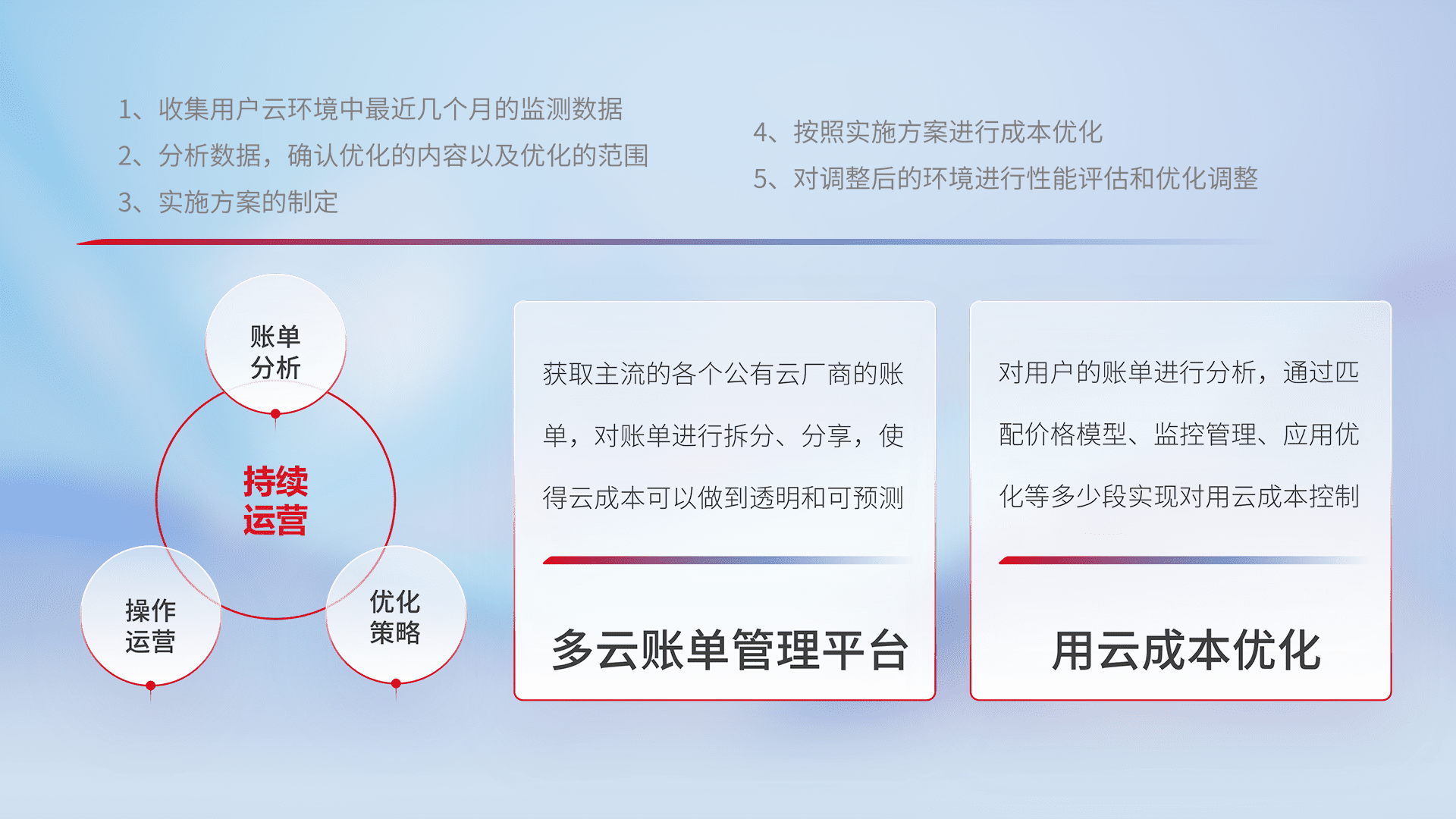 通过多云纳管,,以统一的资源数据模型把客户的云资源进行抽象和封装,,进而实现对多云资源的统一操作,,保障云资源管理的可靠性、、、、稳定性与可用性。。。。量身定制化运维内容,,配置、、、开发运维、、、、补丁管理、、、备份、、监控、、、认证和访问管理、、审计和日常巡检等,,,保障在用云过程中的可靠度,,稳定度以及高可用率。。。。