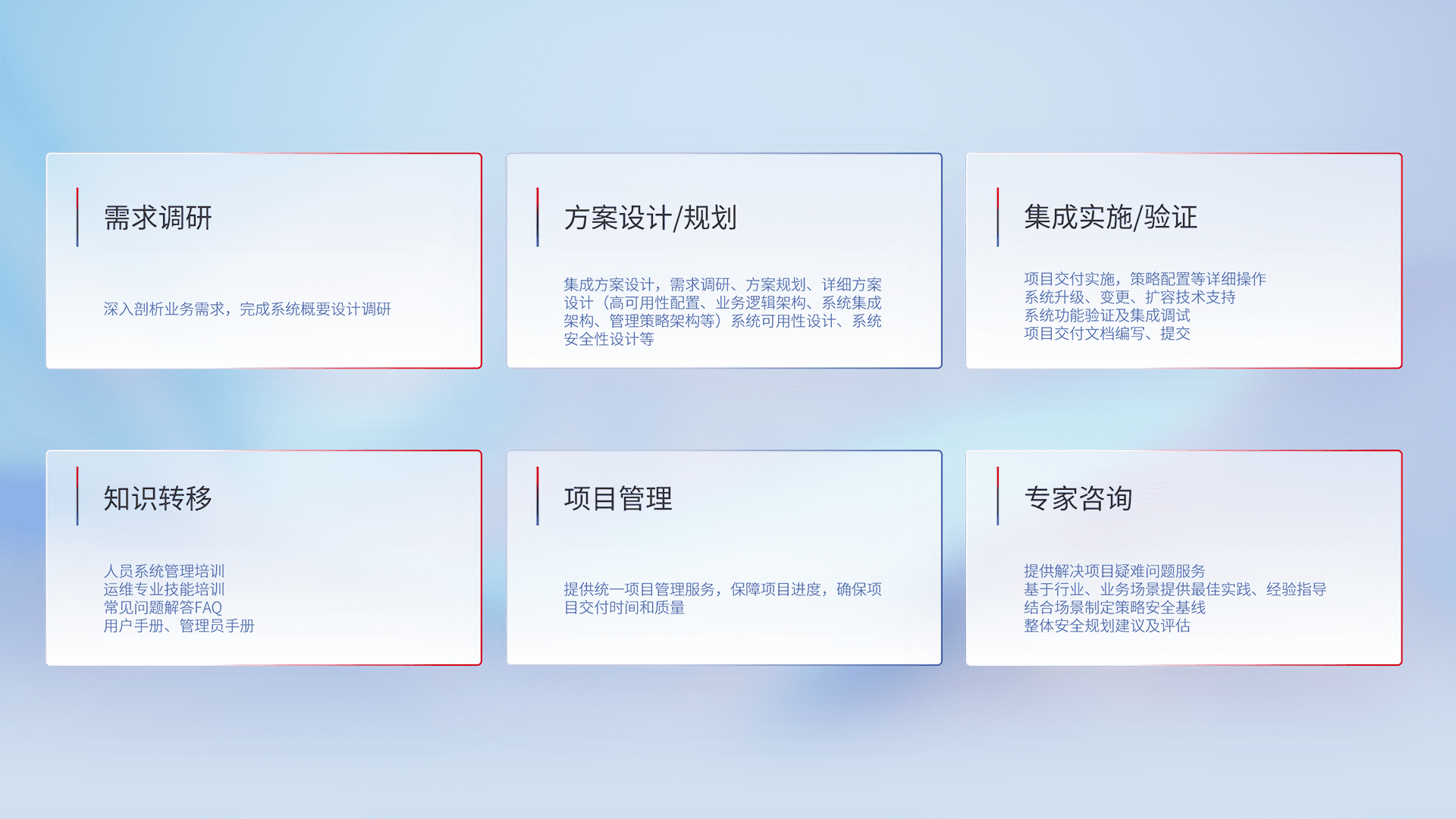 针对客户行业特性,,,将宏观的安全战略和需求,,通过专业的交付服务,,,实现项目落地,,,,为客户提供标准规范的集成交付服务。。